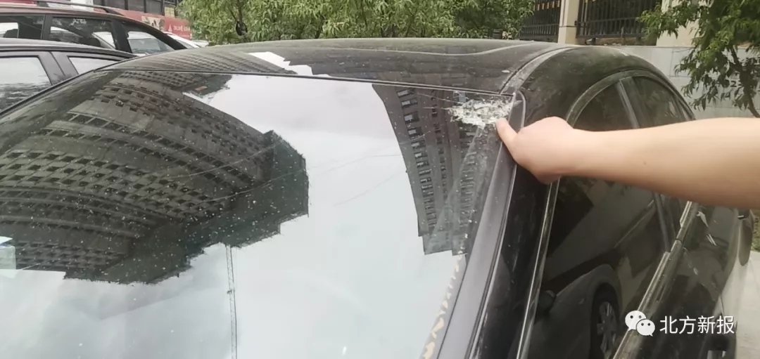 當(dāng)日15時30分,記者在正祥國際小區(qū)三期工地西側(cè)見到了在附近開茶樓的賀先生。他說,他的雷克薩斯汽車是5月份才買的。記者看到,這輛車的前風(fēng)擋玻璃上有一處直徑10厘米左右的放射性裂痕,車頂上有一處明顯被砸的凹陷,車身上落滿了細(xì)碎的水泥點。賀先生說,正祥國際小區(qū)三期工地高空墜物,停在路邊的十幾輛車不同程度受損,他的車最嚴(yán)重。