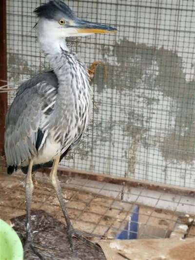 經(jīng)有經(jīng)驗(yàn)的民警辨認(rèn),這是一只蒼鷺幼鳥。這只鳥身高約70公分,長長的尖嘴,身著灰色體羽,頭戴深灰色羽冠,兩條大長腿格外顯眼,白色的前頸縱向排列著黑灰色條紋。民警聯(lián)系獸醫(yī)為其做了體檢,經(jīng)檢查,這只鳥并無傷病,可能是由于剛出窩飛行能力不強(qiáng)、捕食能力不足,造成體力虛弱。民警買來小魚,只見這只鳥狼吞虎咽享用起來,不久便精神十足,開始啄民警??吹剿w力開始恢復(fù),民警懸著的心也就放下了。民警計(jì)劃選擇合適時(shí)間和地方將其放飛。