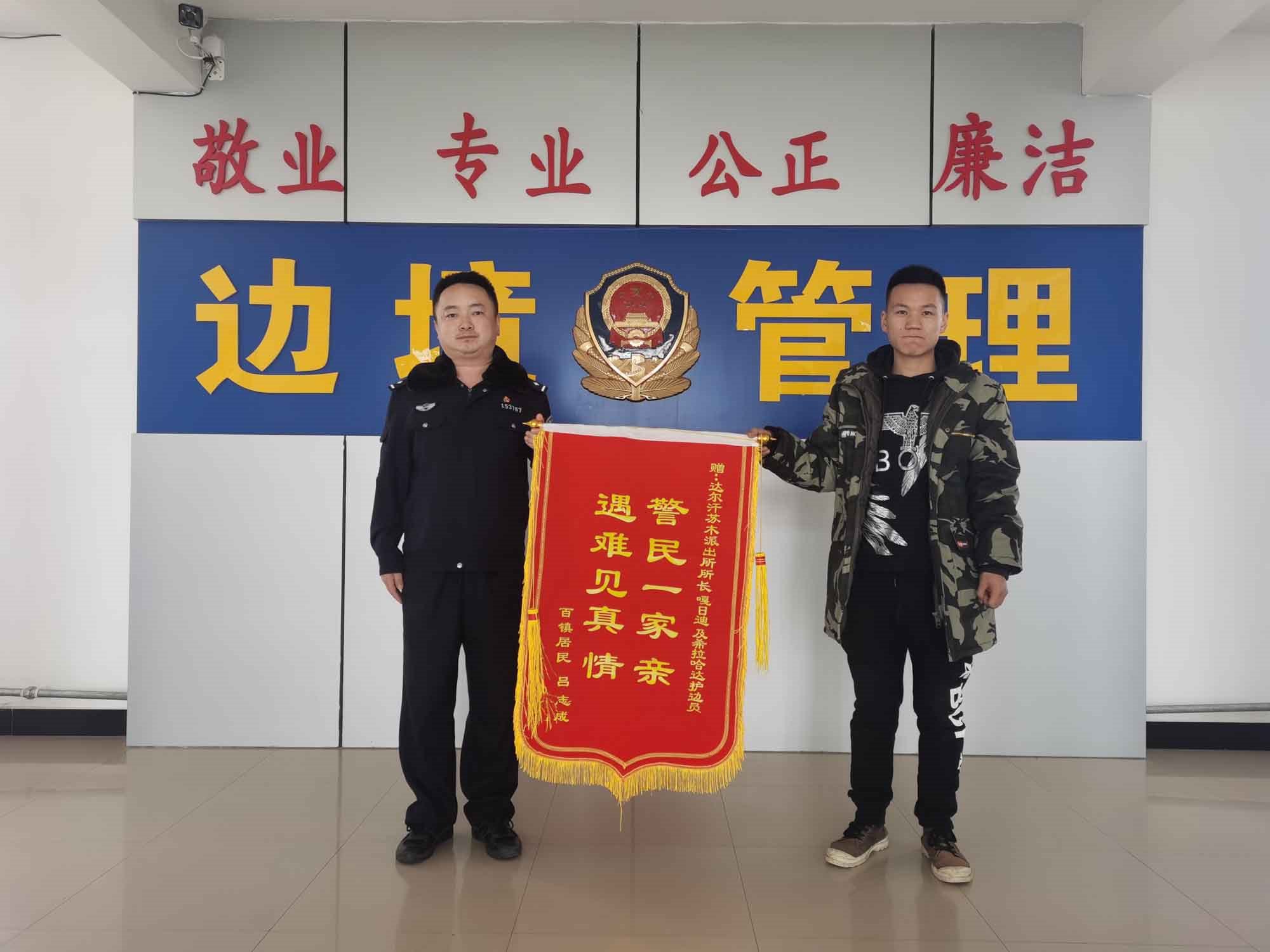 “民警同志太感謝你們了,有你們在我們就感覺安心多了?!?月19日早晨,內(nèi)蒙古包頭市達茂旗達爾罕蘇木牧民那木吉拉“嘎吱嘎吱”的踩著潔白的積雪走進包頭邊境管理支隊達爾罕邊境派出所,一邊說著一邊拿出印有“警民一家親,遇難見真情”的錦旗遞給民警。