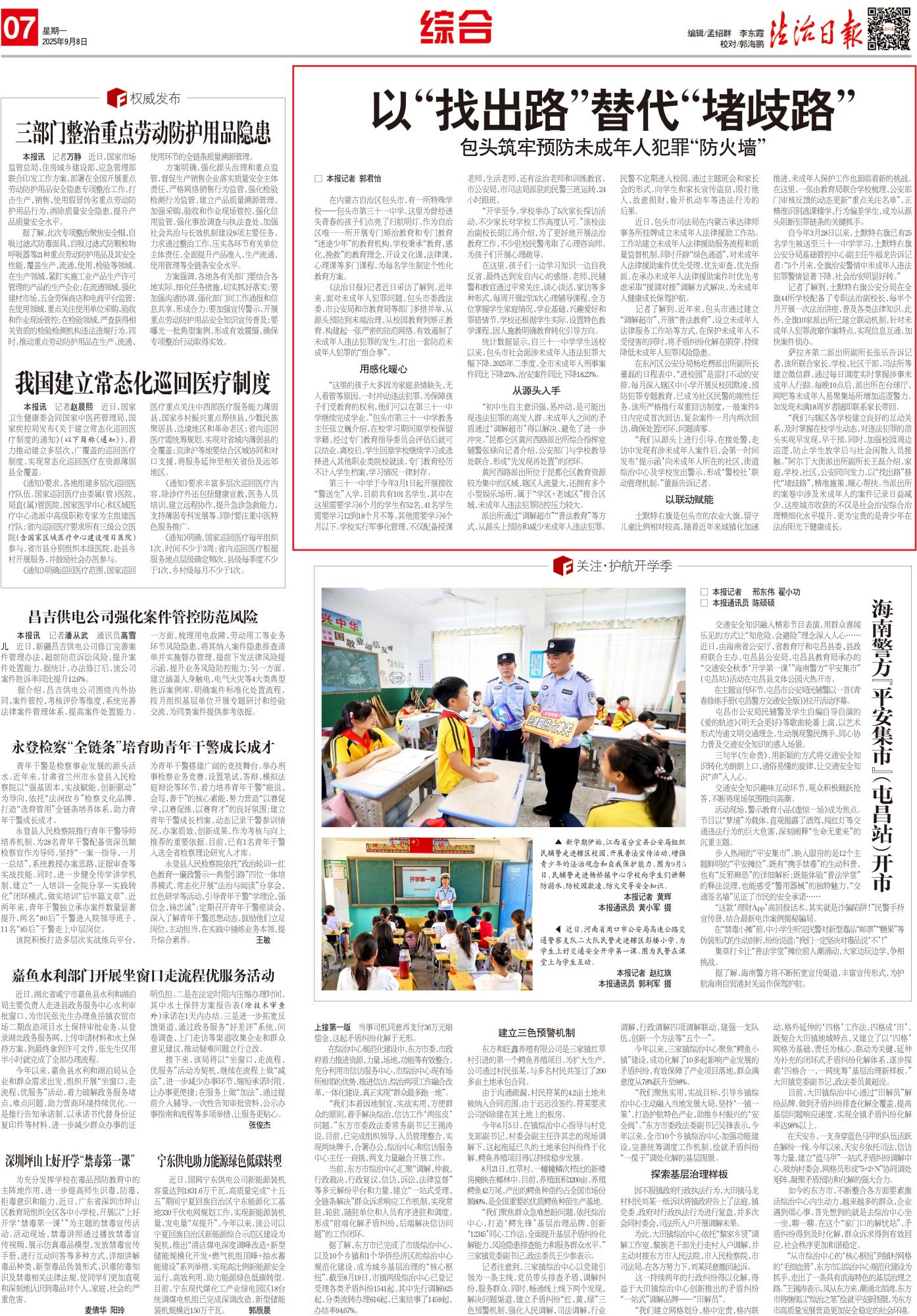 2025年9月8日,《法治日?qǐng)?bào)》第7版整版刊發(fā)題為《以“找出路”替代“堵歧路” 包頭筑牢預(yù)防未成年人犯罪“防火墻”》的文章,報(bào)道了近年來,面對(duì)未成年人犯罪問題,包頭市委政法委、市公安局和市教育局等部門多措并舉,從源頭預(yù)防到末端治理,從校園教育到矯正教育,構(gòu)建起一張嚴(yán)密的防范網(wǎng)絡(luò),有效遏制了未成年人違法犯罪的發(fā)生,打出一套防范未成年人犯罪的“組合拳”。