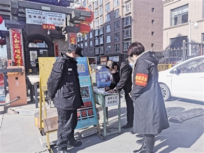 記者跟隨工作人員來到轄區(qū)地新街坊小區(qū),幾名社區(qū)工作人員正在小區(qū)門口負(fù)責(zé)疫情防控,“您好!請問您去哪棟樓?請下車登記信息。謝謝!”“請居民佩戴好口罩”……針對出入小區(qū)的人員,社區(qū)工作人員都一一仔細(xì)核查,宣傳防疫信息。“春節(jié)長假過后,很多事都堆到今天了,所以格外忙?!卑⒗票甭飞鐓^(qū)黨總支書記王海瓊說,阿拉善北路社區(qū)很多網(wǎng)格員都放棄了與家人團(tuán)聚的時間,主動下沉到各個小區(qū)開展疫情防控工作,實(shí)行24小時輪崗制,做好外地返呼人員登記和掃碼工作,保證轄區(qū)防控安全。除此之外,還積極參與禁燃煙花爆竹、垃圾分類宣傳等工作,讓政策落到實(shí)處。