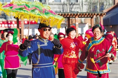 2月8日,在呼和浩特市金地廣場,由社區(qū)居民組成的秧歌隊正在演出。當(dāng)日,呼和浩特市人民路街道辦事處舉辦新春文藝匯演活動,共有18支志愿隊伍、260余人參加,極大豐富了社區(qū)居民文化生活。(記者  懷特烏勒斯  攝)