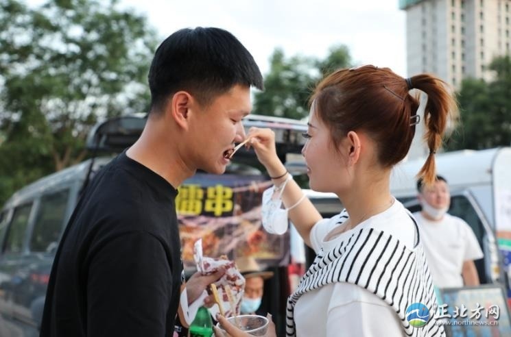 人間煙火氣,最撫凡人心。雖然已是21時許,但是后備廂集市依然人頭攢動,熱鬧非凡,叫賣聲不絕于耳。一家烤腸攤位前,攤主郭浩楠一邊招呼食客,一邊拿著夾子不緊不慢地翻動著烤架上的烤腸,烤好后拿竹簽一穿,伴著滋滋作響的聲音,紅光透亮的烤腸瞬間香氣四溢?!耙呀泤⒓恿撕脦讏隽?,一晚上能售出近百根烤腸,不過我的初衷不是為了賺錢,就是想把自己鐘情的美食分享給大家。”郭浩楠說。