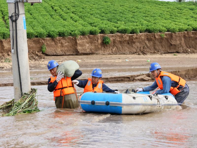 后旗公司運(yùn)維人員用皮劃艇運(yùn)送沙袋,加固10千伏花燈線125號(hào)桿。(攝影:楊雨寧)