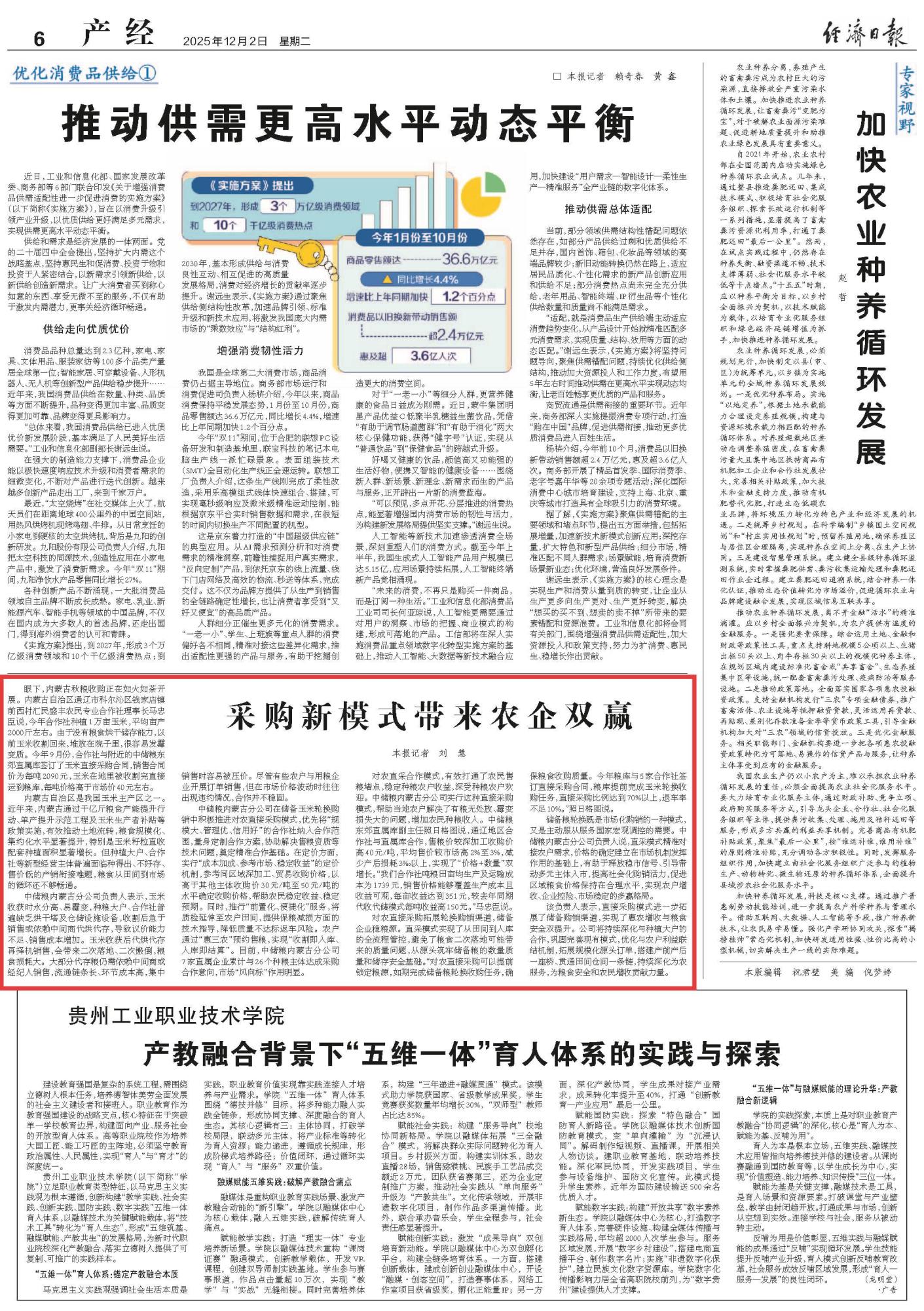 2025年12月2日,《經(jīng)濟(jì)日?qǐng)?bào)》第6版刊發(fā)題為《采購(gòu)新模式帶來(lái)農(nóng)企雙贏》的文章,報(bào)道了近年來(lái),內(nèi)蒙古通過(guò)千億斤糧食產(chǎn)能提升行動(dòng)、單產(chǎn)提升示范工程及玉米生產(chǎn)者補(bǔ)貼等政策實(shí)施,有效推動(dòng)土地流轉(zhuǎn),糧食規(guī)?;?、集約化水平顯著提升,特別是積極推進(jìn)對(duì)農(nóng)直接采購(gòu)模式,進(jìn)一步拓展了儲(chǔ)備購(gòu)銷(xiāo)渠道,實(shí)現(xiàn)了惠農(nóng)增收與糧食安全雙提升。