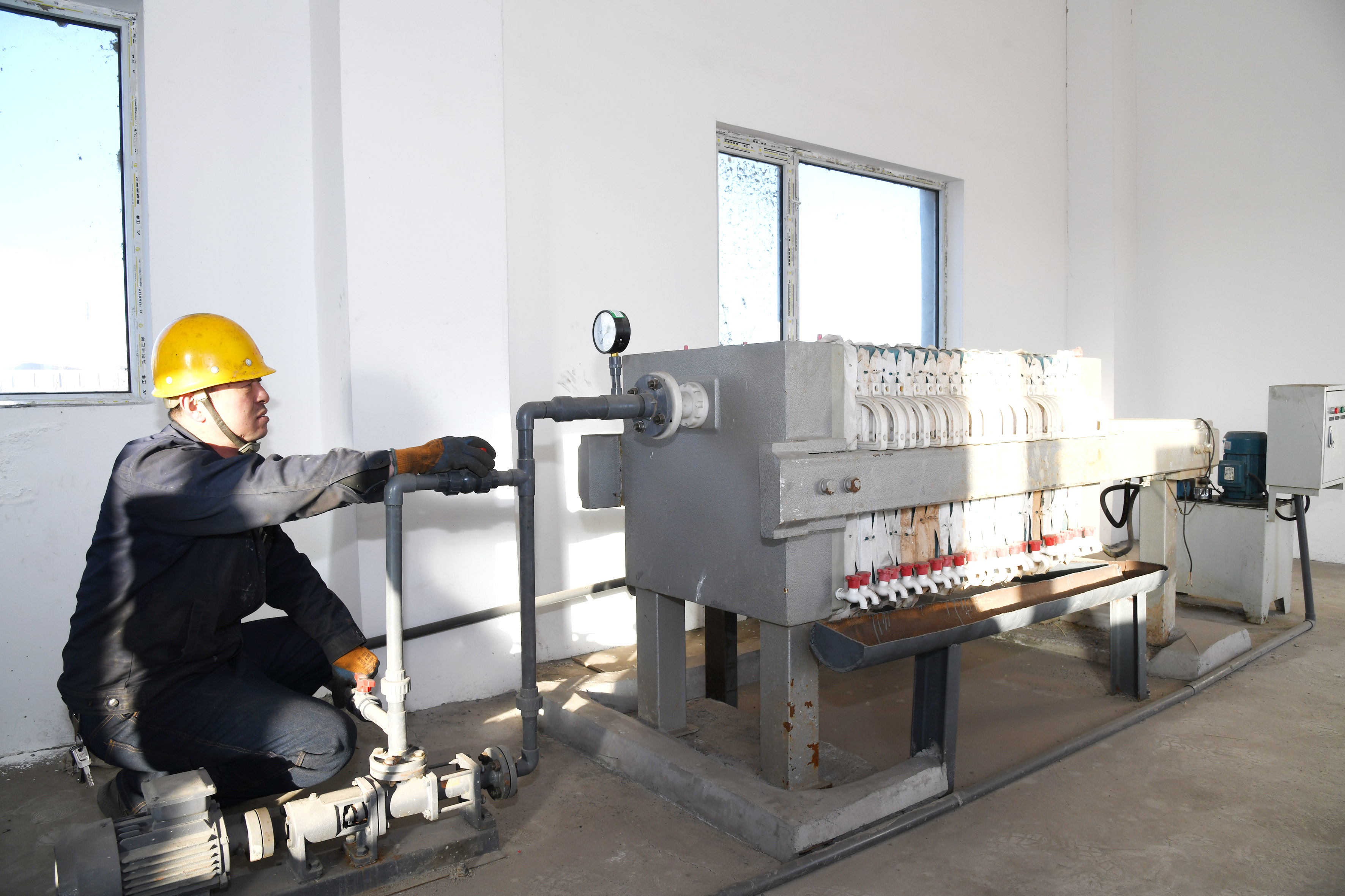 工業(yè)園區(qū)工作人員正在檢查污水處理設(shè)備部件。