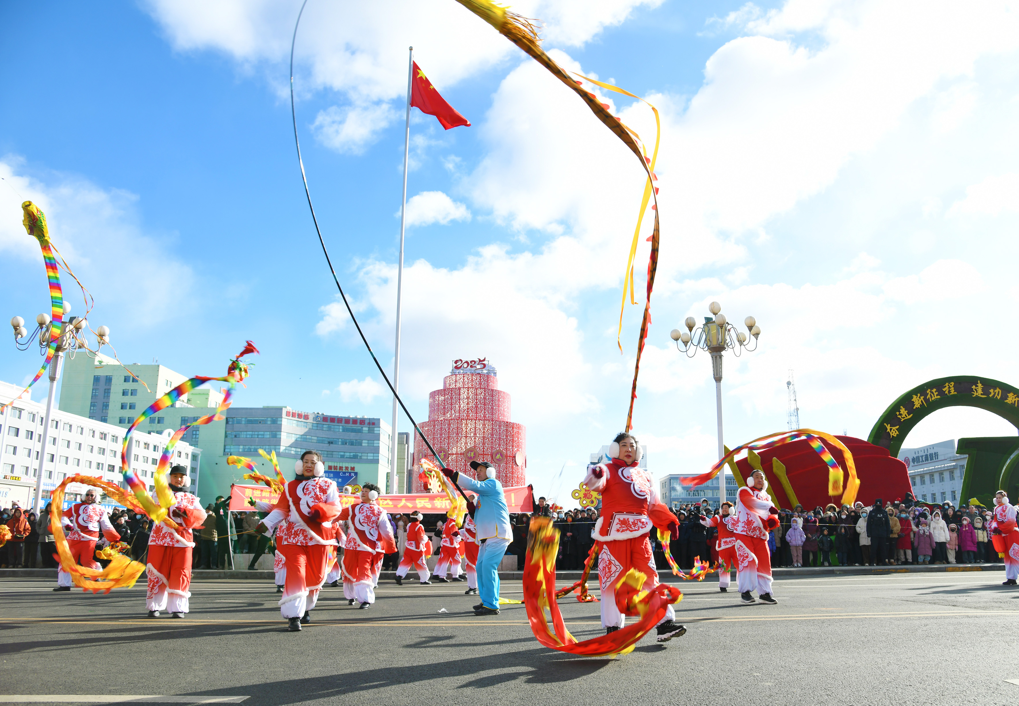 上午9點30分,在一陣鏗鏘有力的鑼鼓聲中,由前進路街道文藝隊帶來的《喜上眉梢》率先登場,表演者身穿絢麗服飾,手持彩帶龍,通過擺動手臂、移動腳步和扭動腰部,讓一條條“彩龍”上下翻飛、左右盤旋。與此同時,手持火紅燈籠的表演者與“彩龍”緊密配合,不斷變化隊形,將新春的蓬勃生機與美好愿景生動地展現(xiàn)出來,贏得陣陣叫好。