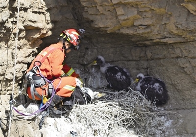 當(dāng)天7時左右,在烏海市海勃灣區(qū)甘德爾山景區(qū)半山腰處,攝影愛好者焦長青在拍攝時發(fā)現(xiàn)了一窩出生20多天的幼年野生黑鸛,其中一只黑鸛行動異常,疑似受傷。他立即撥打了119報警電話,同時聯(lián)系了烏海市野生動物保護部門。9時許,烏海市消防支援支隊光明路特勤站和烏海市野生動物保護部門的工作人員到達現(xiàn)場。經(jīng)勘查,在距離懸崖正下方大約30米處的巖洞內(nèi),一只幼年黑鸛被尼龍繩纏繞住腿部而受傷,不能行動。消防員隨后尋找合適的位置制作錨點。消防員陳意攜帶救援裝備速降到懸崖下方展開營救,一個小時之后,受傷的幼年黑鸛被成功救出,并送往海勃灣區(qū)林業(yè)草原局救助站進行救治。