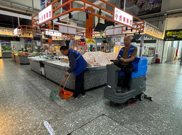 記者在現(xiàn)場看到,市場內燈火通明,幾名保潔人員正在細致地擦拭攤位,有的則在清掃地面上的雜物。而在市場的主通道上,工作人員羅全貴正開著洗地機緩緩前行,機器過后,原本有些油污的地面變得干凈整潔。