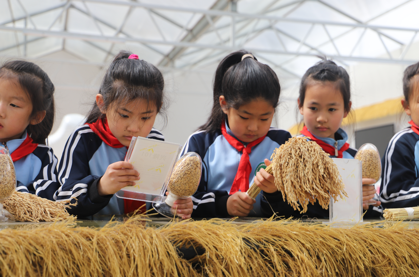 聆聽講解員老師講述大米生長過程