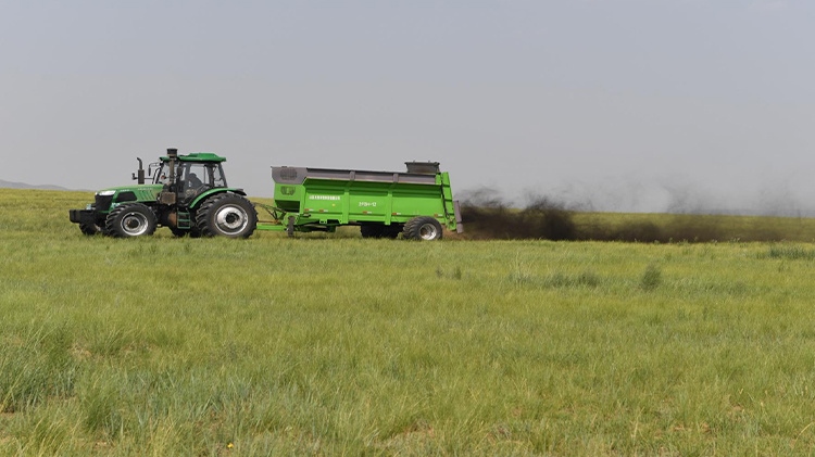 在退化放牧場治理區(qū),施工人員用推土機(jī)推平坑洼不平的風(fēng)蝕坑、整理棄土堆;按照噴幅寬6~8米的行距,用拋肥機(jī)將牛羊固態(tài)糞肥和含有氮、磷、鉀等生物有機(jī)液態(tài)肥拋灑在草場上,增加土壤肥力;用切根機(jī)將稀疏的羊草切開、促進(jìn)分蘗繁殖、復(fù)壯,增加種群密度;采用栽設(shè)4×4米網(wǎng)格狀沙幛、覆蓋草簾來降溫保墑抗旱保苗,與此同時與項目區(qū)牧戶簽訂三年的禁牧、生態(tài)補(bǔ)償、管護(hù)協(xié)議。