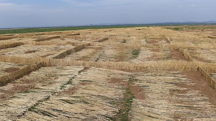 栽設(shè)4×4米網(wǎng)格狀沙幛、覆蓋草簾