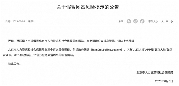 ·北京人社局就近期出現(xiàn)假冒網(wǎng)站發(fā)布風(fēng)險(xiǎn)提示。