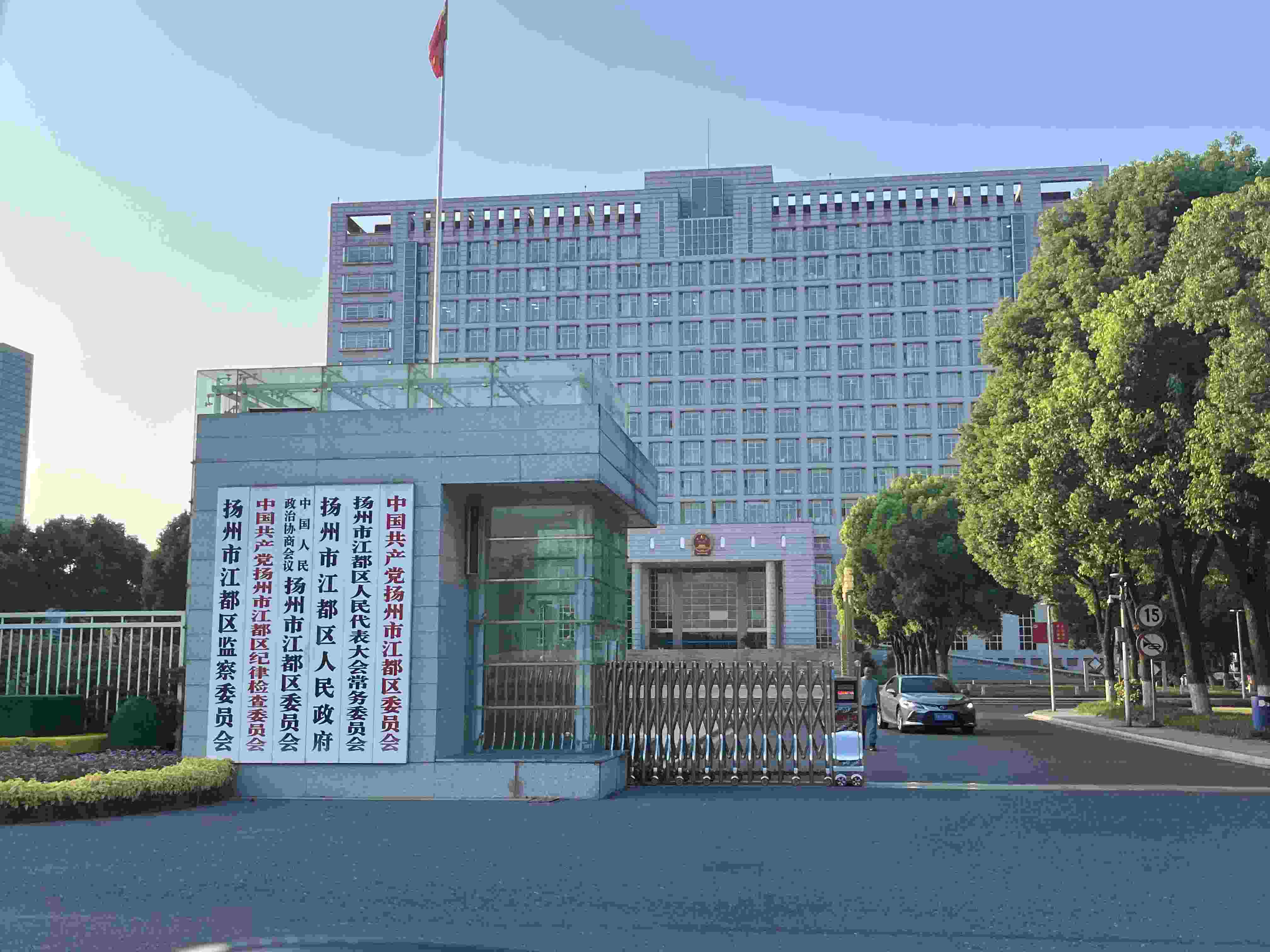 江都區(qū)政府門(mén)前?!案邥?shū)記”“孫主任”曾在此“演戲”騙取受害人信任。