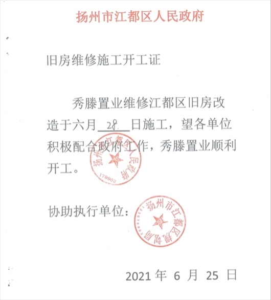 “搞定”西苑社區(qū)后,楊某軍偽造一份《揚(yáng)州市江都區(qū)人民政府舊房維修施工開(kāi)工證》,并加蓋“揚(yáng)州市江都區(qū)人民政府 178962”“揚(yáng)州市江都區(qū)規(guī)劃局”公章。周女士獲得該證后,立即組織顧先生進(jìn)場(chǎng)施工?!皸钅耻娮屛蚁葔|付材料款和人工費(fèi),后面等財(cái)政撥款就行。我就安排顧先生7月1日進(jìn)場(chǎng)施工。”
