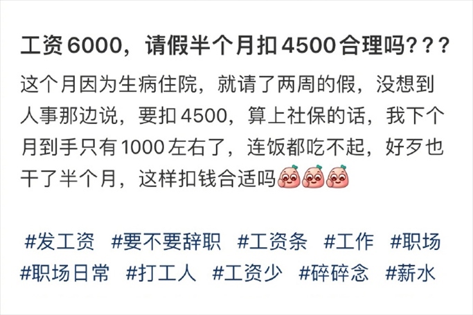 “月薪6000請假兩周被扣4500”沖上熱搜榜一,這事兒合理合法嗎
