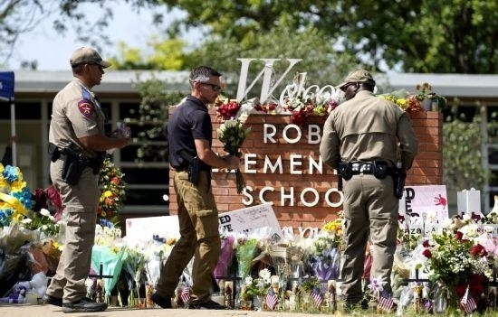 2022年5月27日,警察在美國得克薩斯州南部尤瓦爾迪市發(fā)生槍擊事件的小學(xué)外擺放花束。新華社記者吳曉凌攝