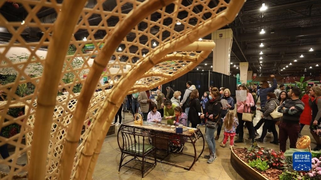 3月4日,在美國(guó)費(fèi)城花展上,孩子們現(xiàn)場(chǎng)體驗(yàn)中國(guó)傳統(tǒng)竹編。新華社記者 張墨成 攝
