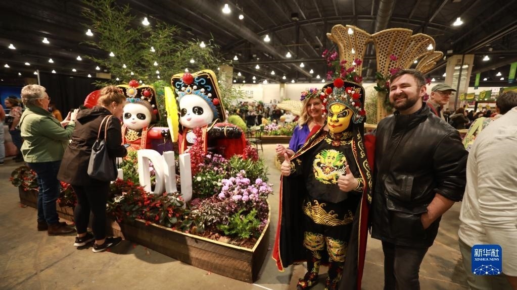 3月4日,在美國(guó)費(fèi)城花展上,人們?cè)诔啥颊箞@入口處的“川劇熊貓”造型前拍照。新華社記者 張墨成 攝
