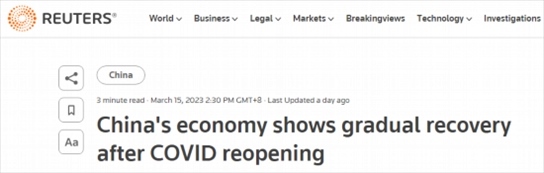 路透社也在15日的報道表示,盡管全球需求及房地產(chǎn)行業(yè)持續(xù)低迷,但2023年前兩個月中國經(jīng)濟(jì)活動在消費和基礎(chǔ)設(shè)施投資的推動下穩(wěn)步回升,從疫情的影響中恢復(fù)。