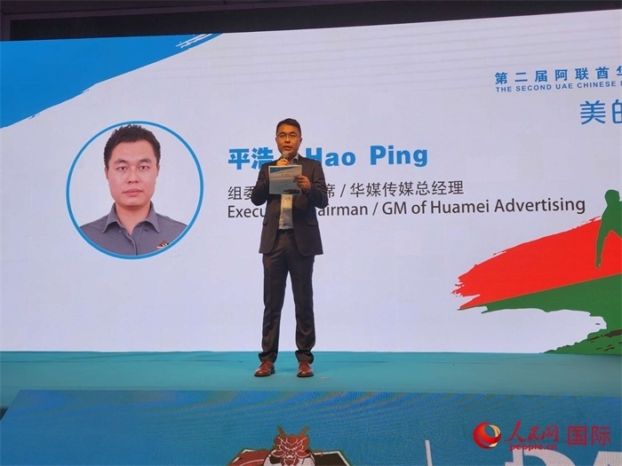阿聯(lián)酋第二屆華人足球聯(lián)賽賽事組委會(huì)執(zhí)行主席平浩在頒獎(jiǎng)典禮暨答謝晚宴上致辭。人民網(wǎng)記者 管克江攝