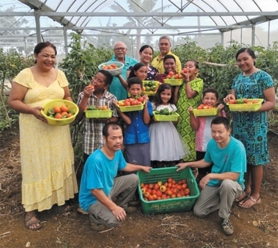 湯加農(nóng)戶拉姆齊一家和中方技術(shù)人員一起展示大棚里采摘的蔬菜。本報記者 陳效衛(wèi)攝