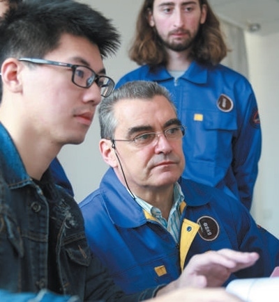 在葡萄牙塞圖巴爾理工學院魯班工坊,中方教師(左)為葡方師生介紹機電一體化設(shè)備。 葡萄牙塞圖巴爾理工學院魯班工坊供圖