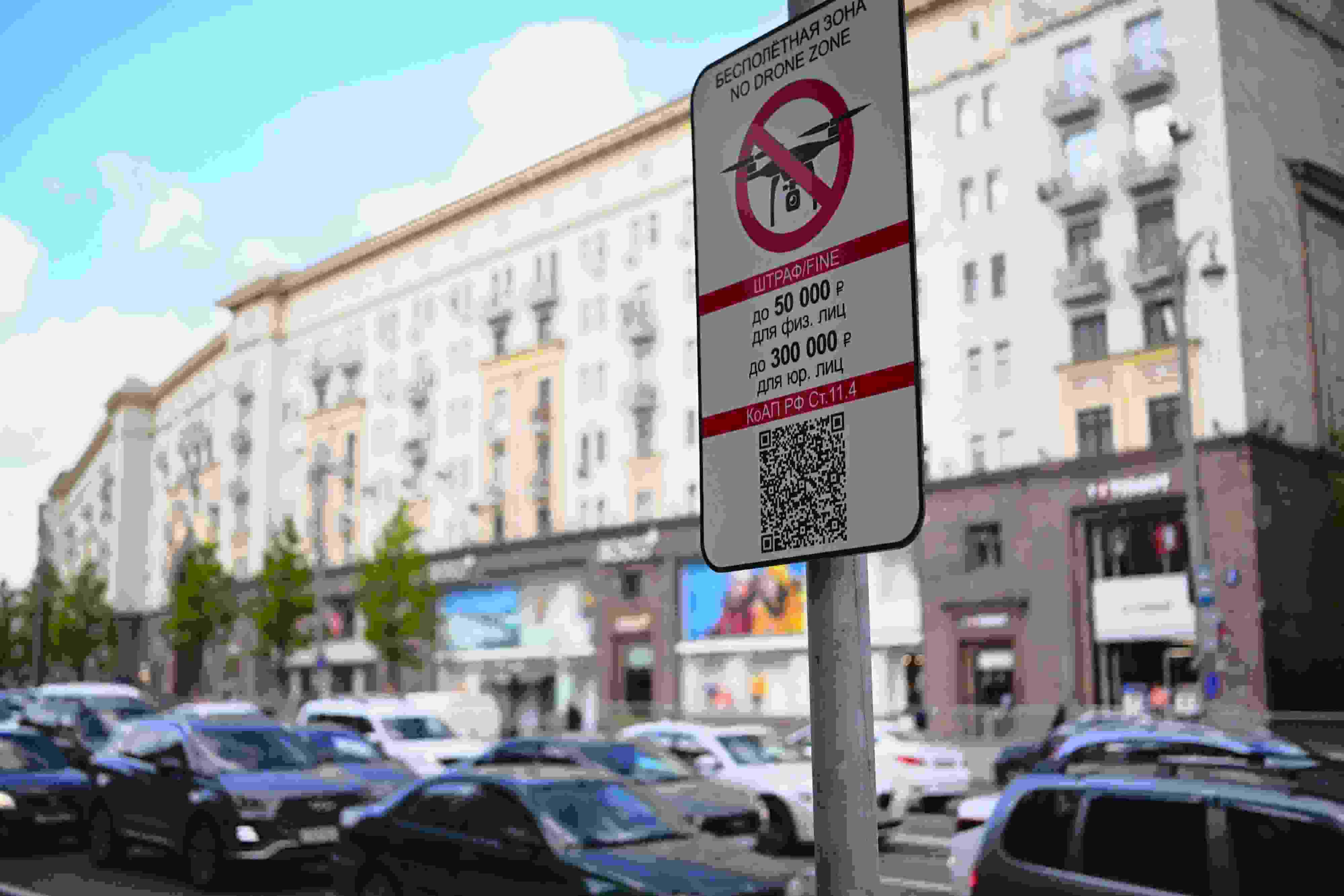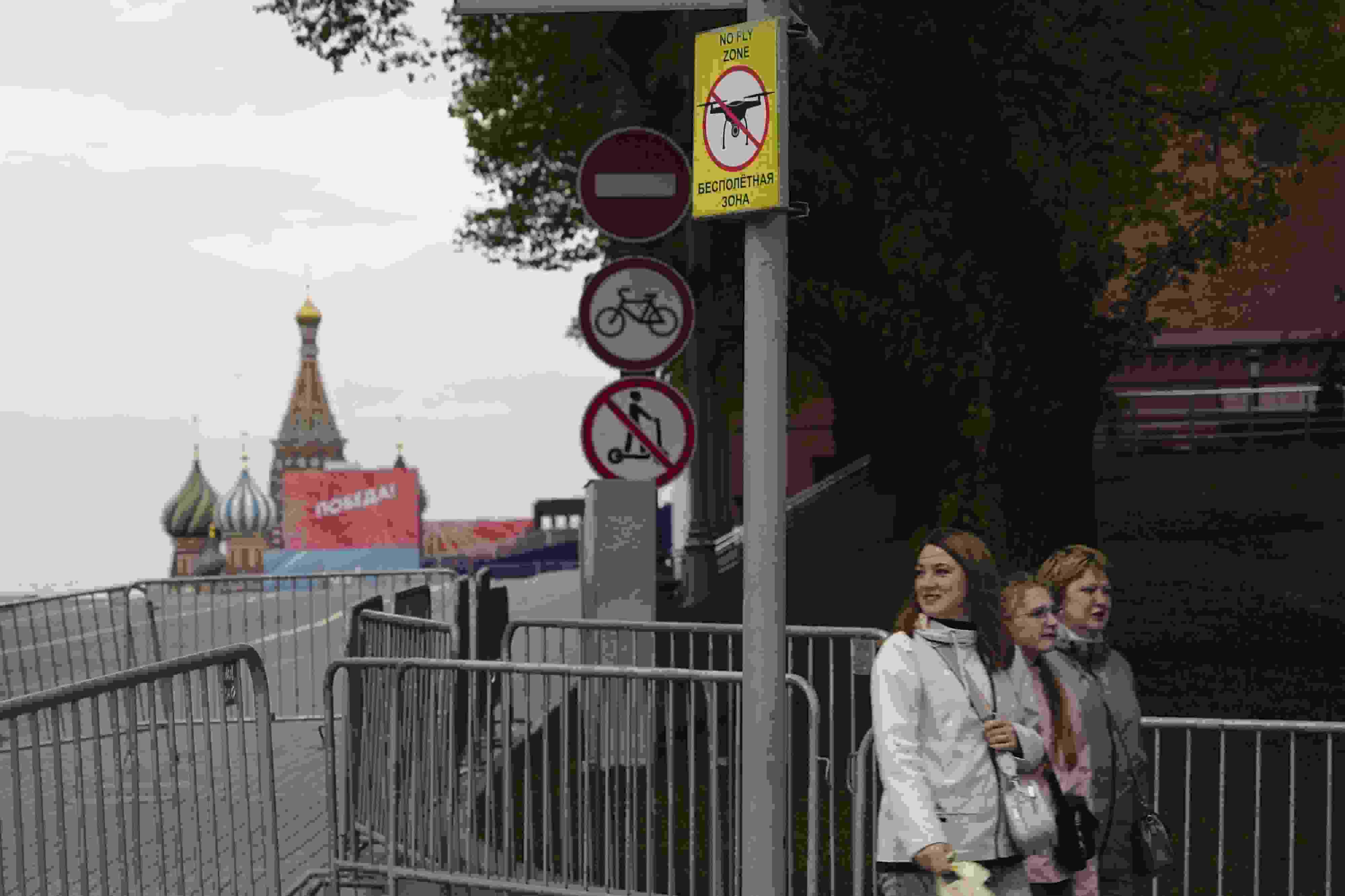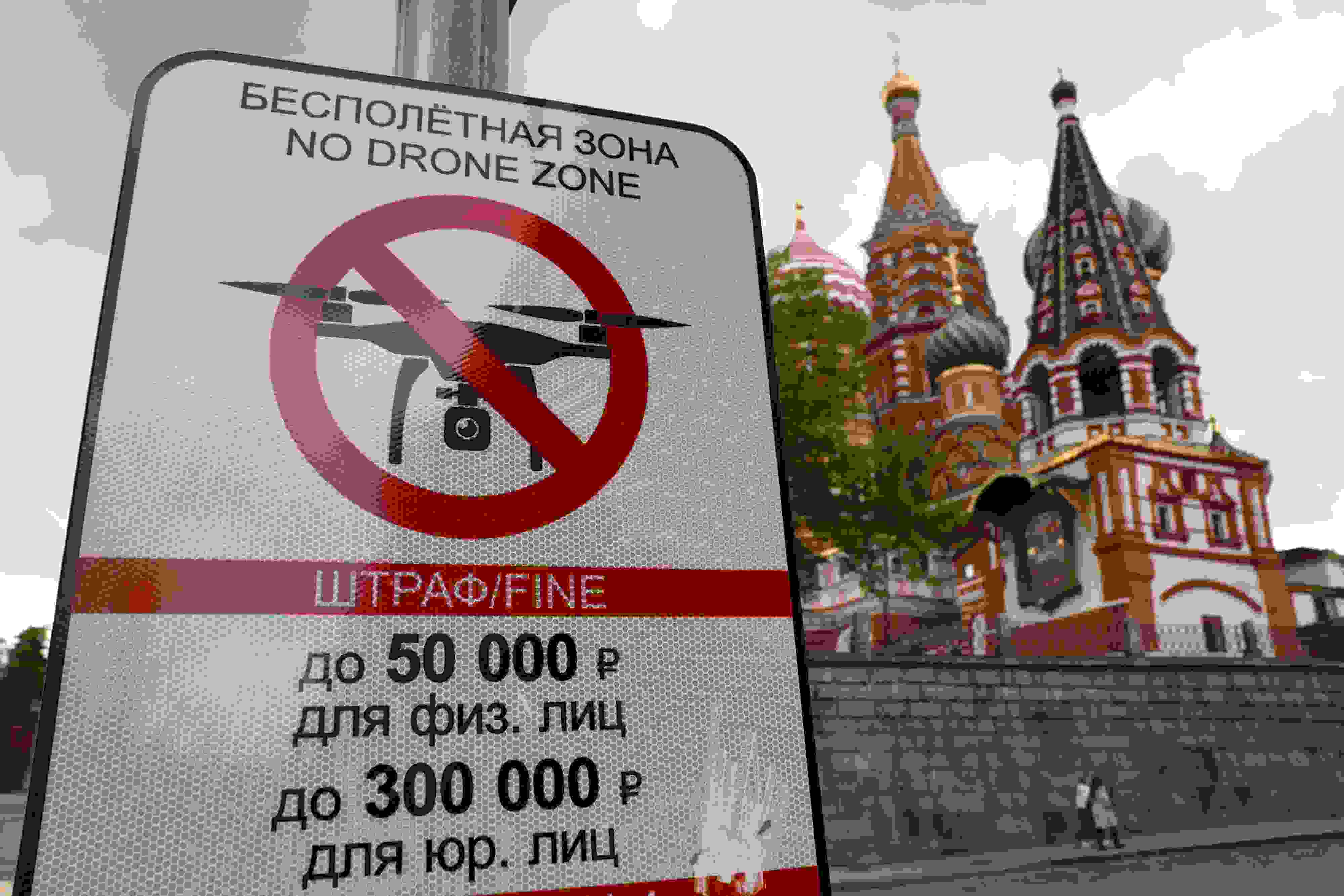 當(dāng)?shù)貢r(shí)間2023年5月3日,俄羅斯莫斯科,莫斯科市中心懸掛的“無人駕駛飛機(jī)禁飛區(qū)”的標(biāo)志,禁止無人機(jī)在該地區(qū)飛行??死锬妨謱m遭無人機(jī)襲擊后,莫斯科市長(zhǎng)宣布禁止未經(jīng)授權(quán)的無人機(jī)在俄羅斯首都上空飛行。 視覺中國(guó)