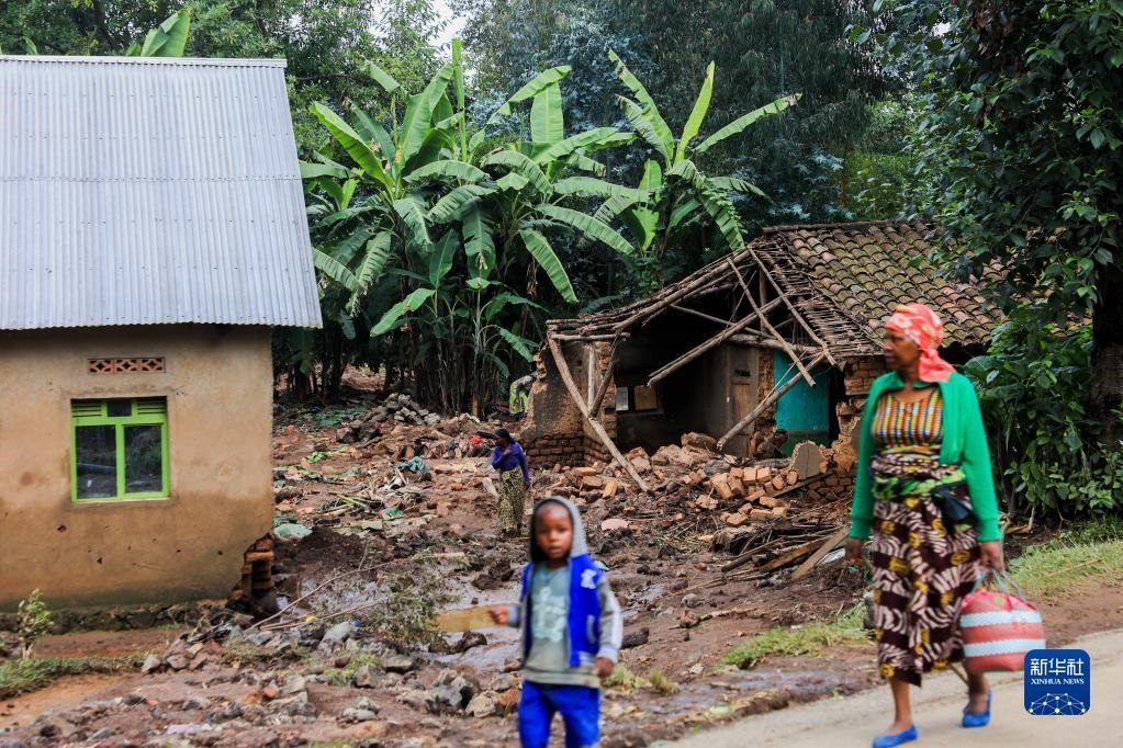 5月4日,在盧旺達(dá)西方省,人們經(jīng)過在強(qiáng)降雨和洪水中受損的房屋。