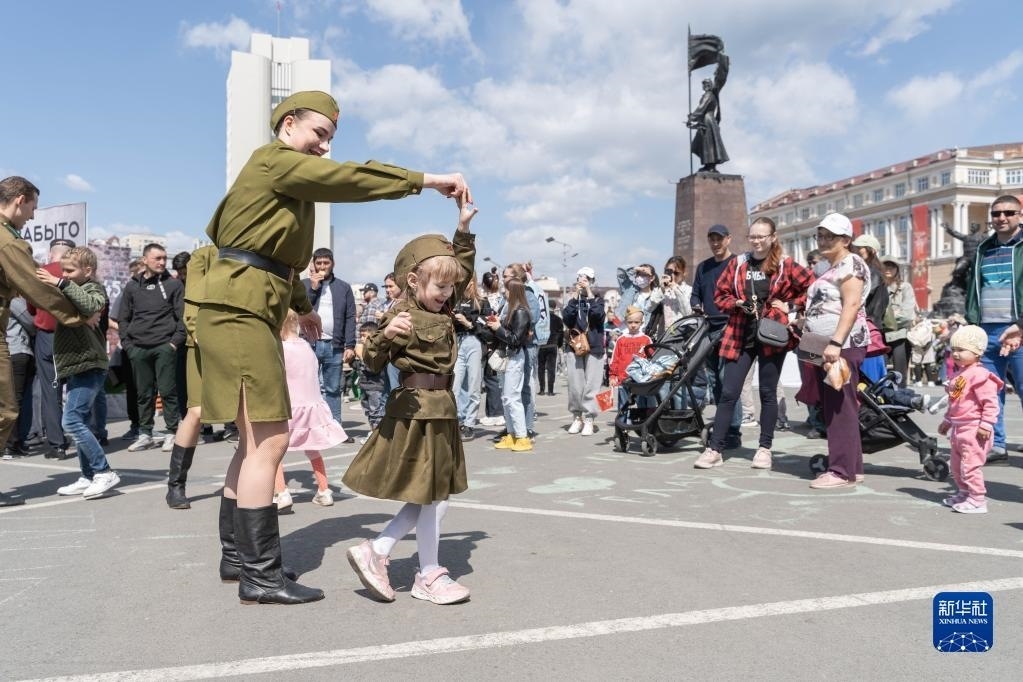 5月9日,在俄羅斯符拉迪沃斯托克,身穿模仿二戰(zhàn)時(shí)期蘇軍軍服的市民在廣場(chǎng)上跳舞。   新華社發(fā)(郭飛洲攝)