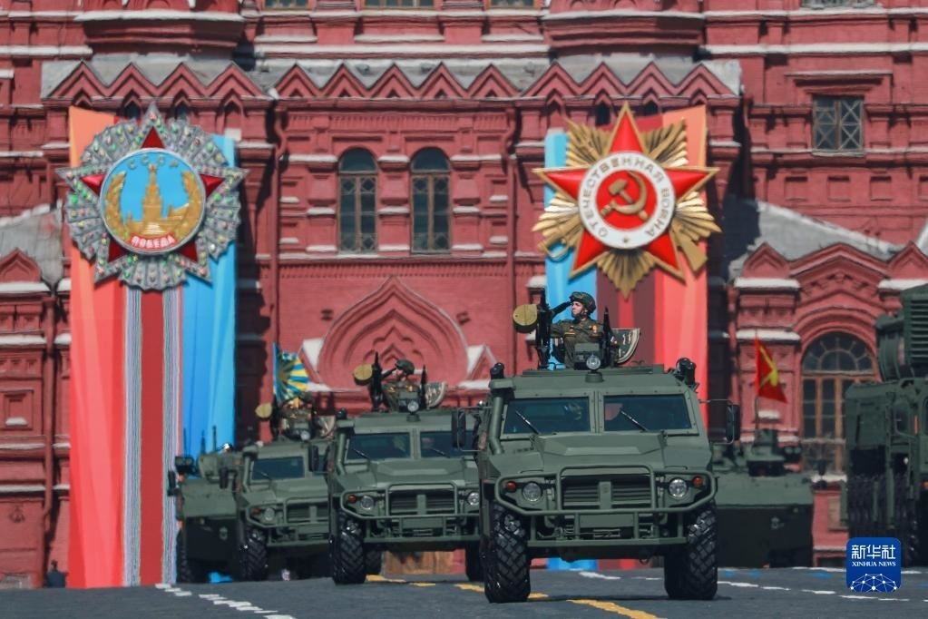 5月9日,在俄羅斯首都莫斯科,軍車編隊(duì)駛過紅場(chǎng)。   新華社記者 曹陽 攝