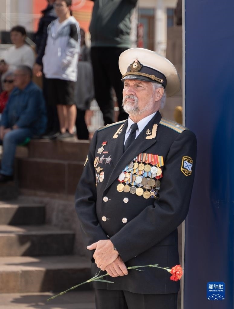 5月9日,在俄羅斯符拉迪沃斯托克,一位老兵參加勝利日慶?;顒?dòng)。   新華社發(fā)(郭飛洲攝)
