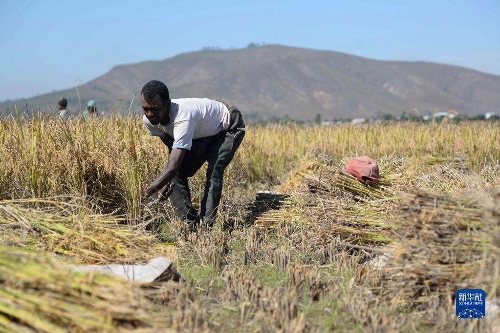 5月12日,在馬達加斯加首都塔那那利佛附近馬希奇鎮(zhèn)的中國國家雜交水稻工程技術(shù)研究中心非洲分中心,當?shù)剞r(nóng)民在雜交水稻高產(chǎn)示范田內(nèi)收割水稻。   新華社發(fā)(西塔卡·拉喬納里松攝)