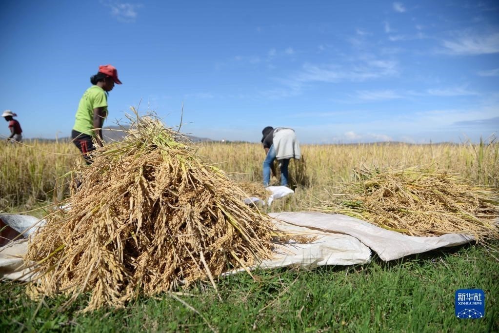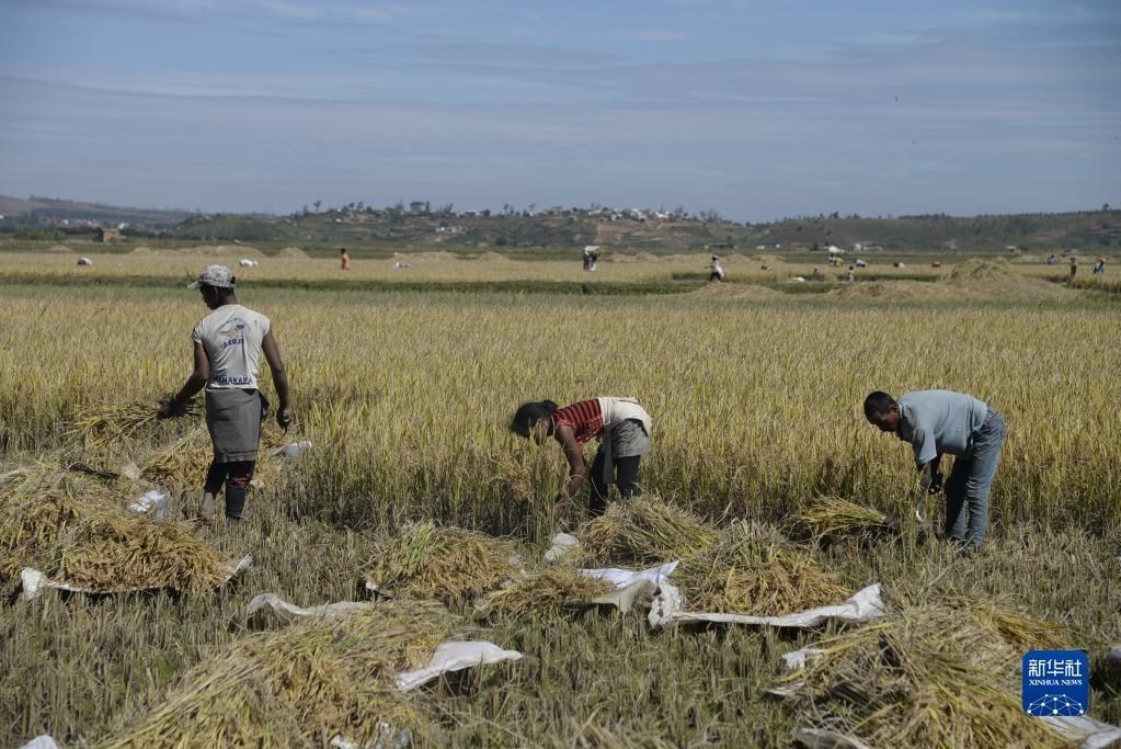 5月12日,在馬達加斯加首都塔那那利佛附近馬希奇鎮(zhèn)的中國國家雜交水稻工程技術(shù)研究中心非洲分中心,當?shù)剞r(nóng)民在雜交水稻高產(chǎn)示范田內(nèi)收割水稻。