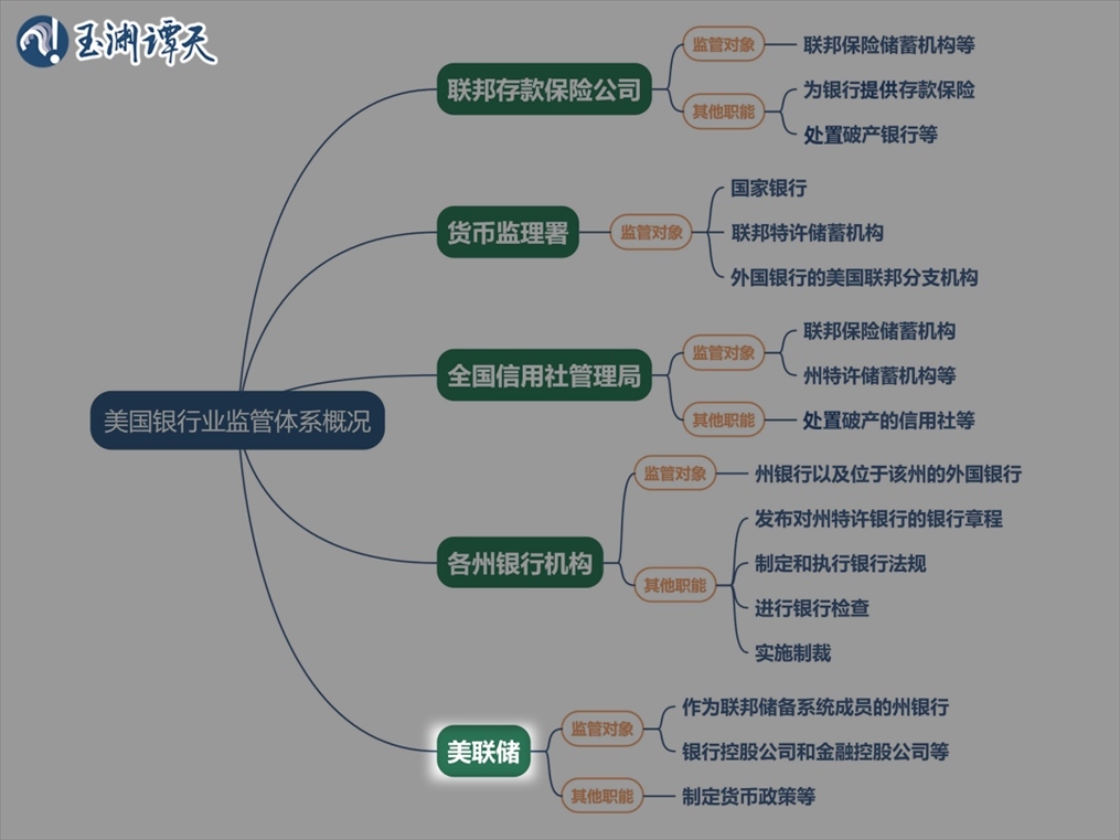 讓我們重新看回這張圖,可以看到,按照美國銀行業(yè)監(jiān)管體系的分工,美聯(lián)儲(chǔ)負(fù)責(zé)監(jiān)管所有成員銀行的正常運(yùn)行。