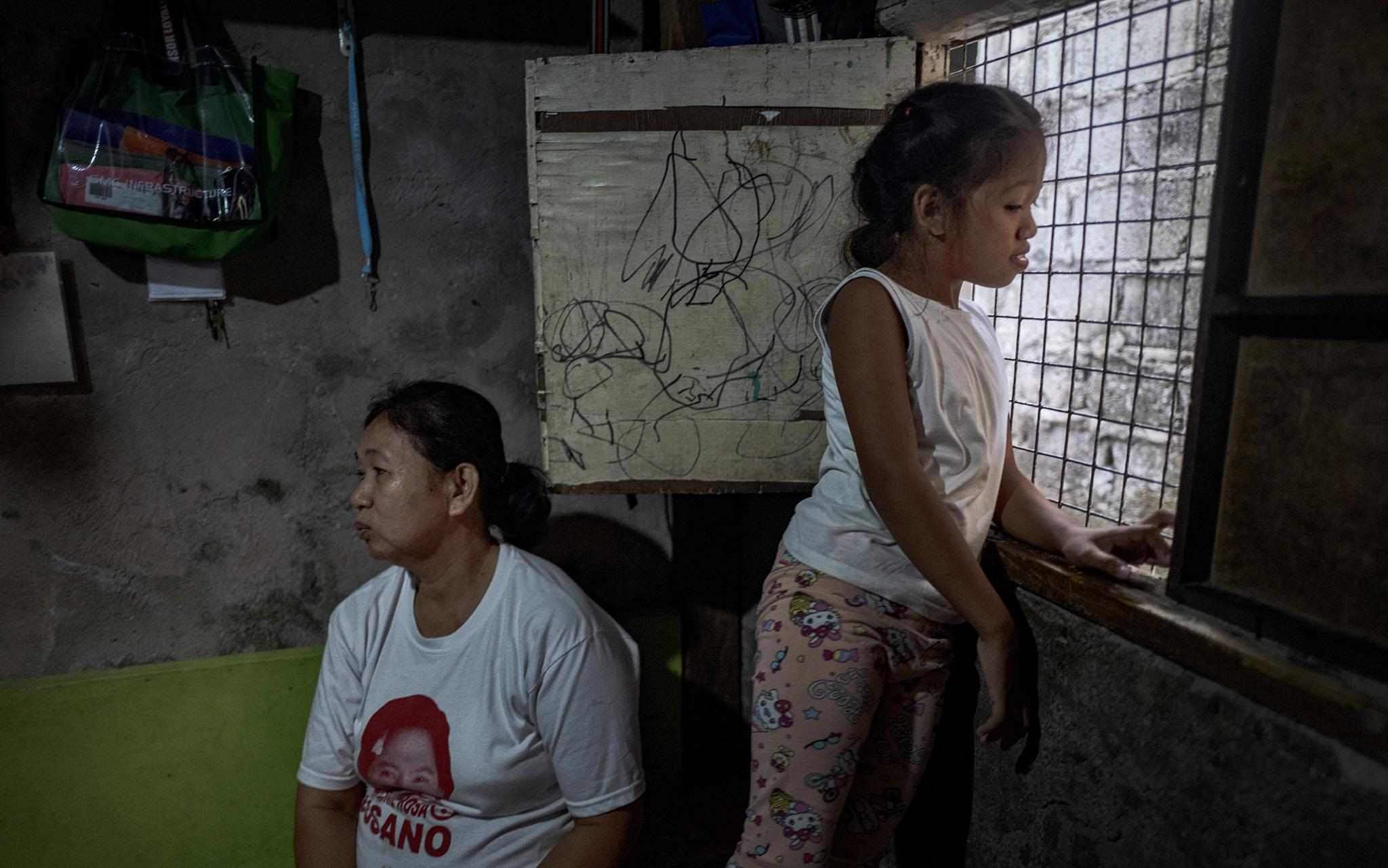 當(dāng)?shù)貢r(shí)間2023年4月15日,菲律賓馬尼拉,奎松市,Corazon Mercado(左)和她的女兒Bea坐在家里。據(jù)Corazon Mercado說:“我們買不起大瓶或散裝的必需品,我們只能買得起小袋的日常必需品。”