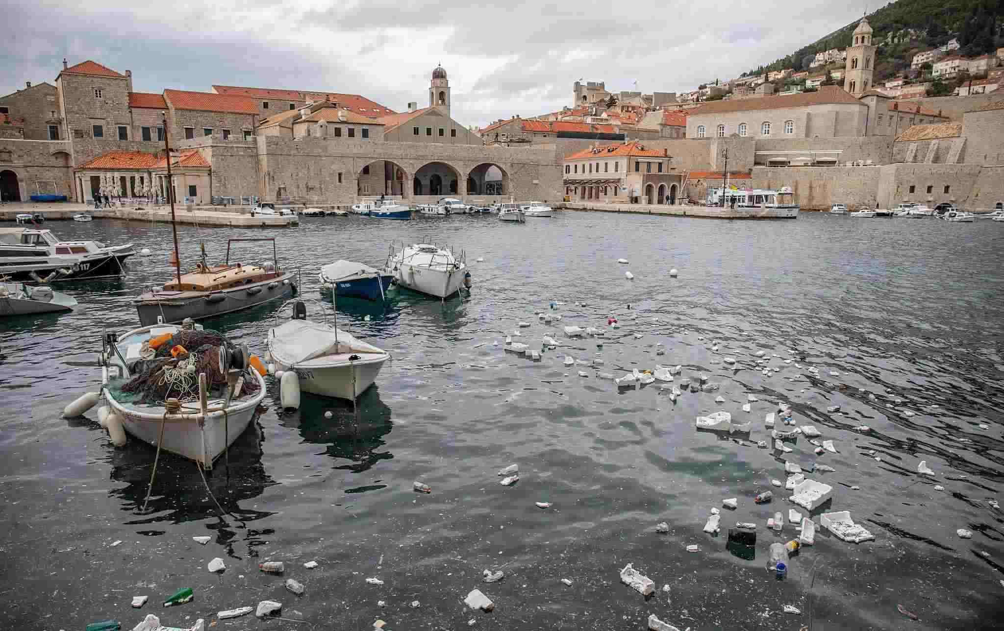 當(dāng)?shù)貢r(shí)間2023年2月27日,克羅地亞杜布羅夫尼克,大風(fēng)過后,塑料垃圾漂浮在舊城港口。