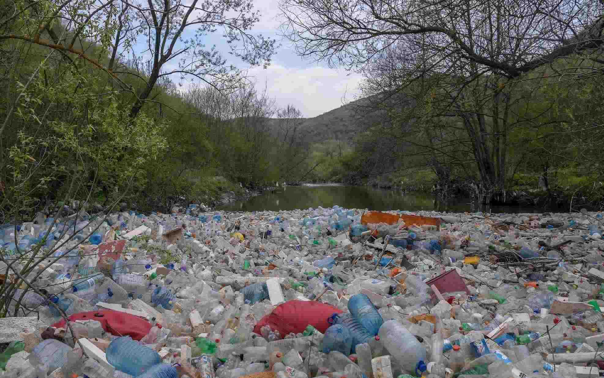當(dāng)?shù)貢r(shí)間2023年4月22日,科索沃地區(qū),摩拉瓦河漂浮著大量廢棄的塑料瓶和其他垃圾。