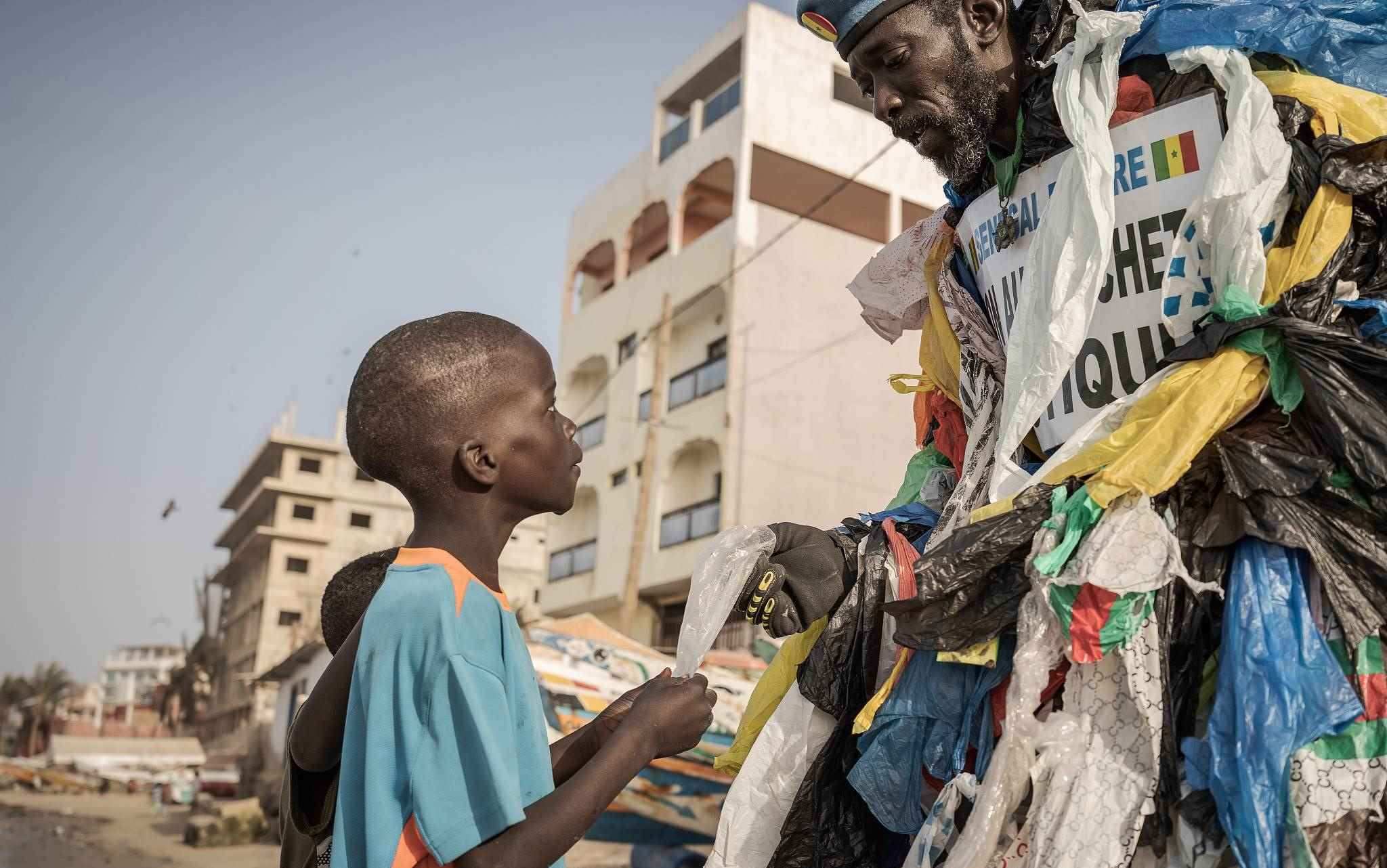 當(dāng)?shù)貢r(shí)間2023年4月5日,塞內(nèi)加爾達(dá)喀爾,49歲的塞內(nèi)加爾環(huán)保活動(dòng)家莫杜·法爾,被稱為“塑料人”,和一個(gè)孩子在海灘上散步時(shí)拿著一個(gè)塑料包裝,提醒人們注意使用一次性塑料的污染。