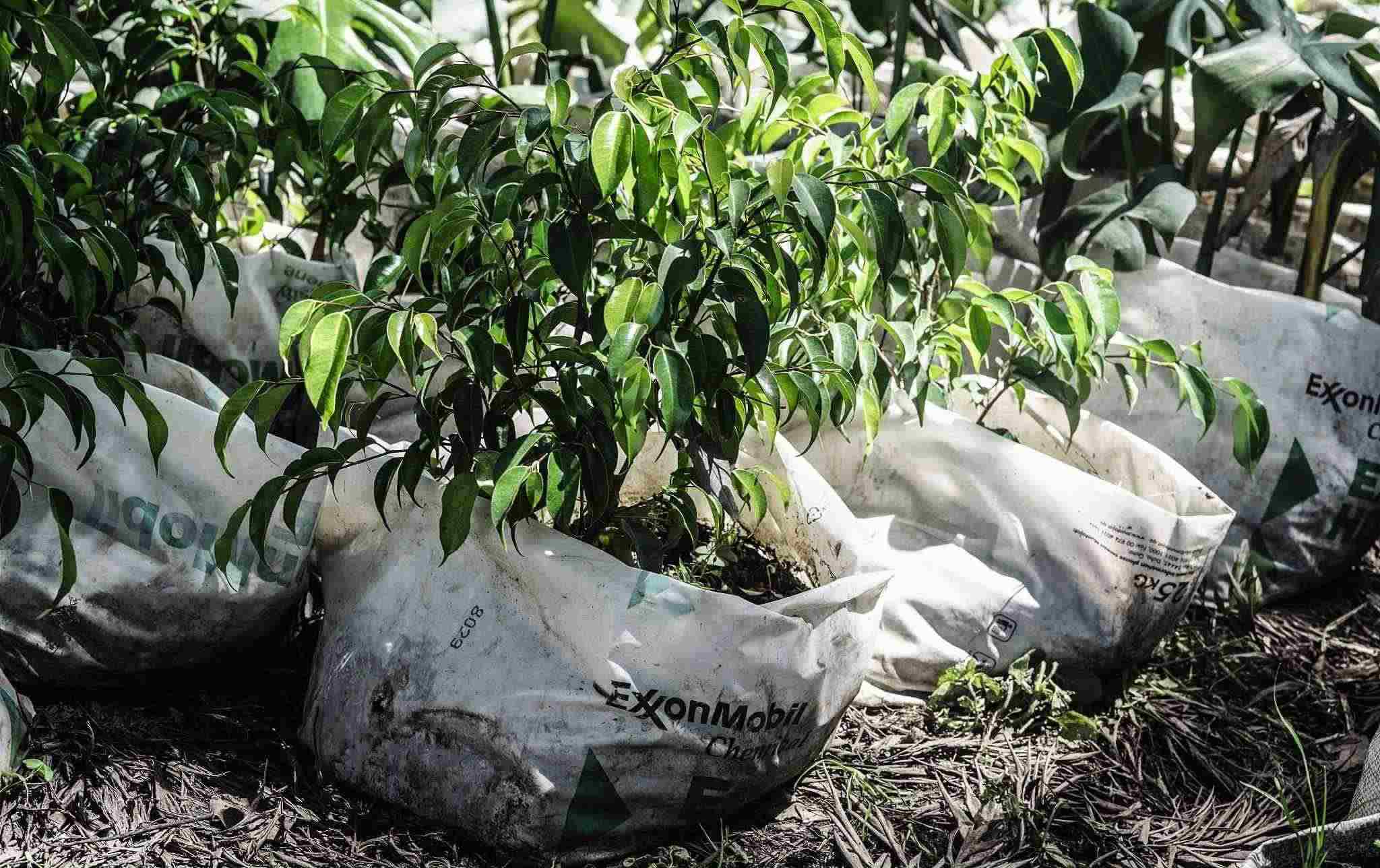 當(dāng)?shù)貢r(shí)間2023年5月7日,肯尼亞納庫魯?shù)拿缙岳?,埃克森美孚包裝袋包裹著一棵樹苗。隨著世界充斥著塑料廢物,政府間談判委員會(huì)(INC)內(nèi)塑料條約的支持者正在倡導(dǎo)一項(xiàng)具有法律約束力的文書,減少石化工業(yè)生產(chǎn)的原生塑料。