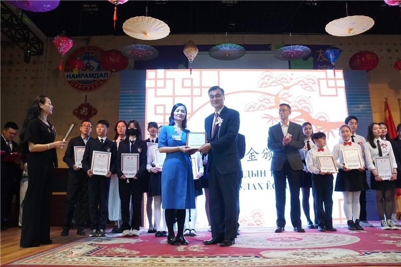 柴文睿大使為旅蒙華僑蒙中友誼學校優(yōu)秀生頒發(fā)大使獎學金。學校供圖