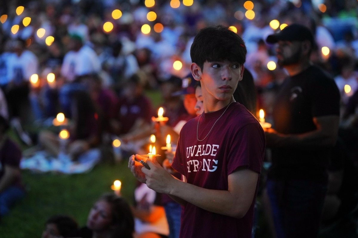2023年5月24日,在美國(guó)得克薩斯州小城尤瓦爾迪,人們參加守夜儀式悼念校園槍擊遇害者。圖源:新華社