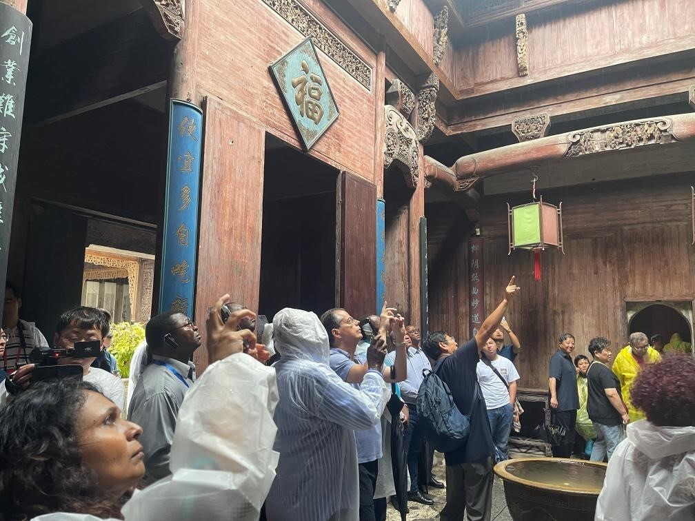 秋雨連綿中,使節(jié)們來到世界文化遺產(chǎn)地宏村。被雨水打濕的蓮葉搖曳在微涼的風中,青石板路在雨中泛起柔和的光,徽派建筑的粉墻黛瓦在雨中顯得格外寧靜淡雅,一幅悠然的水墨畫躍然眼中。樂敘堂、敦厚堂、敬德堂……古建筑承載的厚重中華文化令使節(jié)們沉醉其中。