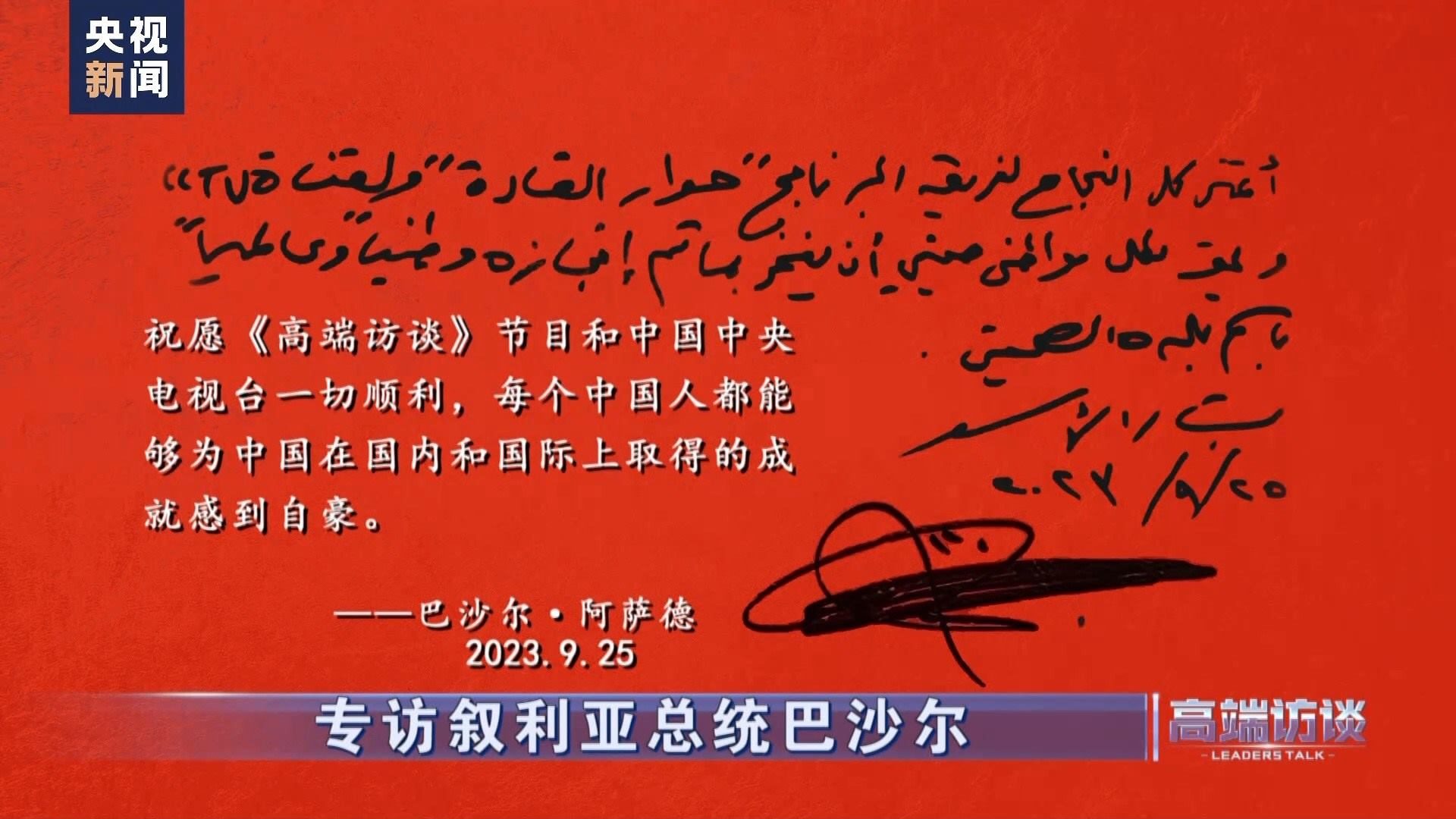 敘利亞總統(tǒng)巴沙爾在接受總臺專訪后題詞:祝愿《高端訪談》節(jié)目和中國中央電視臺一切順利,每個中國人都能夠?yàn)橹袊趪鴥?nèi)和國際上取得的成就感到自豪!