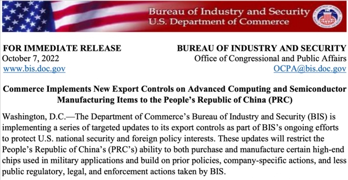 2022年10月7日,美國商務部工業(yè)和安全局發(fā)布半導體出口管制新規(guī)。圖源:美國商務部網(wǎng)站