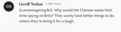 “危言聳聽。中國人為什么要浪費時間監(jiān)視英國人?他們肯定有更好的事情要做,除非他們這么做是為了搞笑?!?/p>
