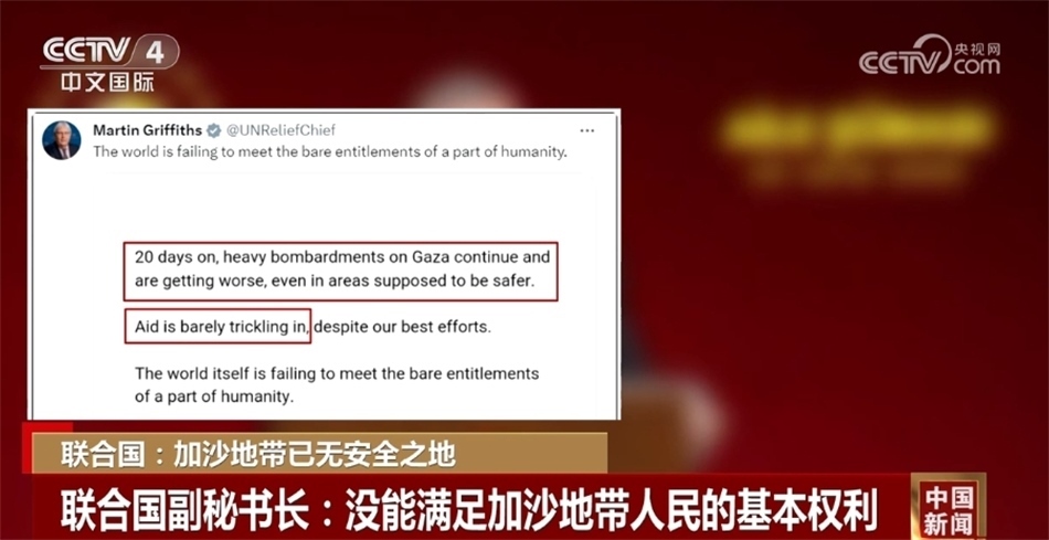 同一天,聯(lián)合國(guó)分管人道主義事務(wù)的副秘書長(zhǎng)馬丁·格里菲斯在社交媒體發(fā)文稱,在過去20天里,對(duì)加沙地帶的猛烈轟炸愈發(fā)嚴(yán)重,一些本該安全的地區(qū)也已經(jīng)陷入危險(xiǎn),但援助物資卻很難進(jìn)入加沙地帶,國(guó)際社會(huì)沒能滿足一部分人的基本權(quán)利。