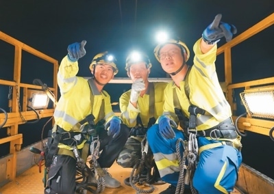 中國師傅潘貴(右)帶領老撾徒弟馮圖(左)以及馮圖的徒弟康更(中)一同登乘軌道車作業(yè)。