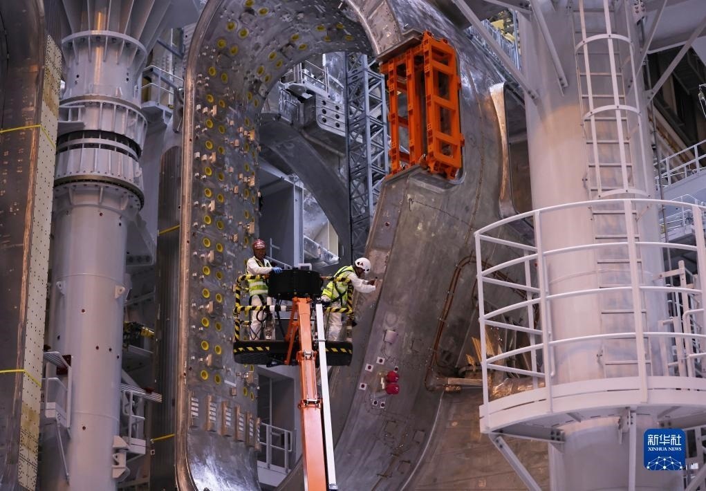 11月24日,在位于法國圣保羅-萊迪朗斯的國際熱核聚變實(shí)驗(yàn)反應(yīng)堆(ITER)預(yù)組裝大廳里,高高的吊架上懸著一個(gè)超大豌豆形金屬設(shè)備,吊斗里的技術(shù)人員正在對(duì)它進(jìn)行檢查。新華社記者 高靜 攝