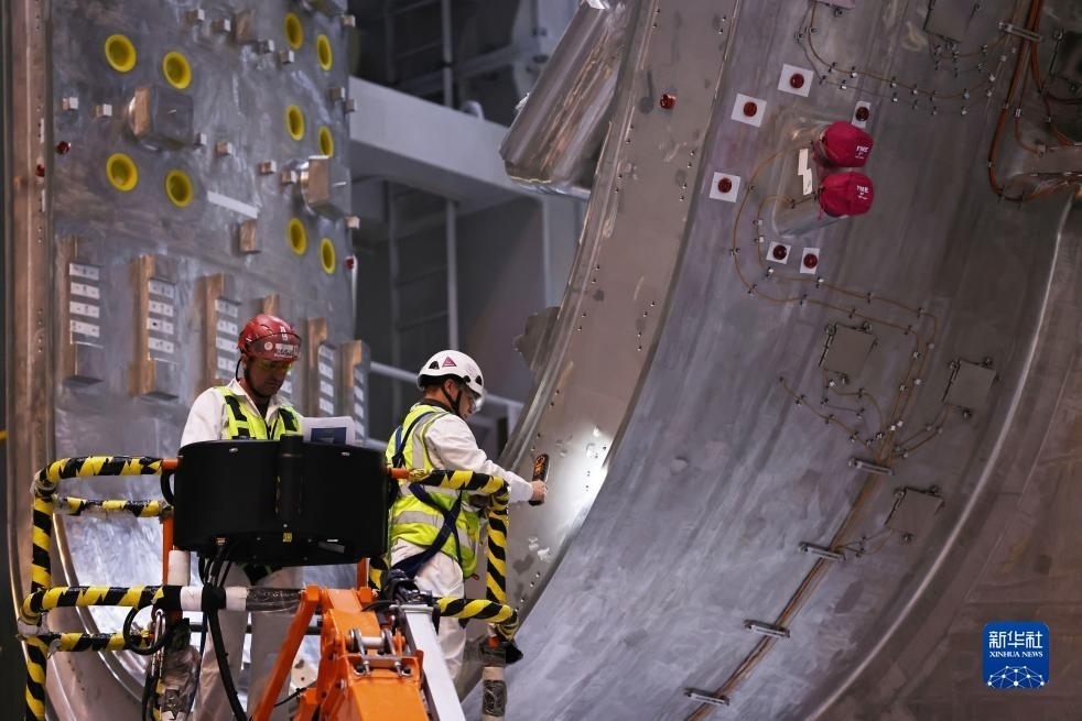 ?這是11月23日在位于法國圣保羅-萊迪朗斯的國際熱核聚變實(shí)驗(yàn)反應(yīng)堆(ITER)預(yù)組裝大廳內(nèi)拍攝的接受檢查的超大型設(shè)備。新華社記者 高靜 攝